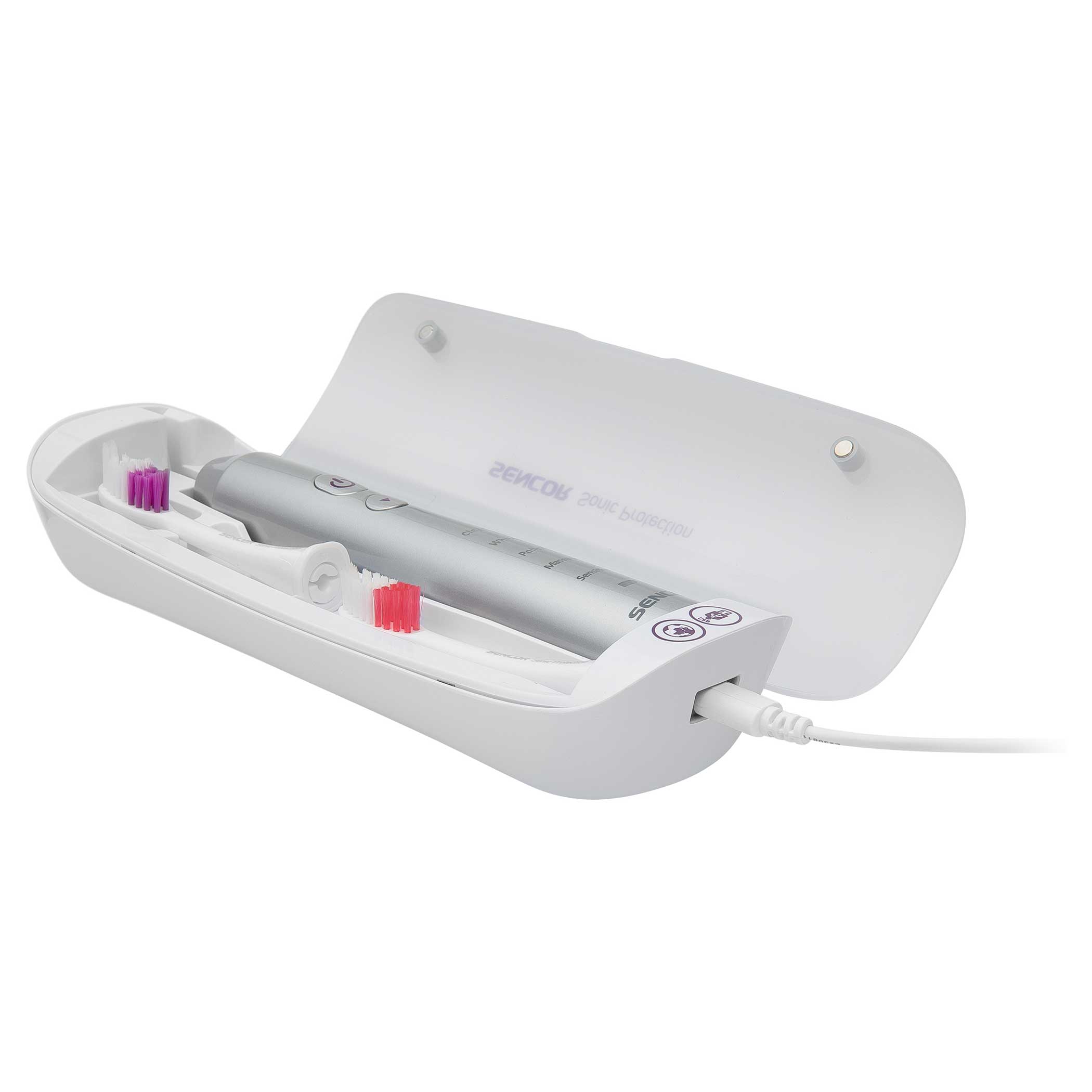 المحتويات المُضمنة: 1 هيكل فرشاة أسنان، 2 رؤوس أساسية، 1 محطة شحن مع حامل في واحد،